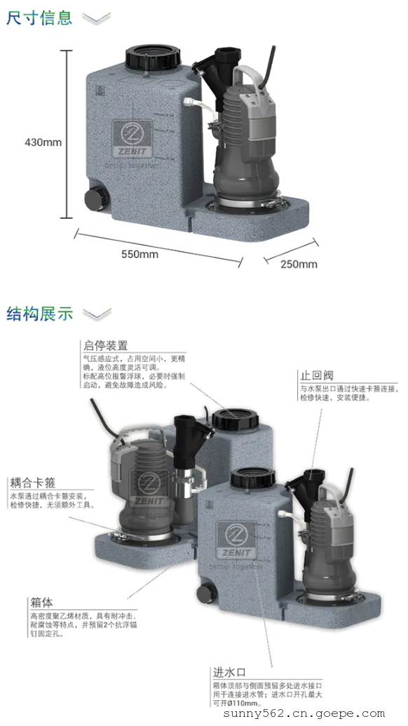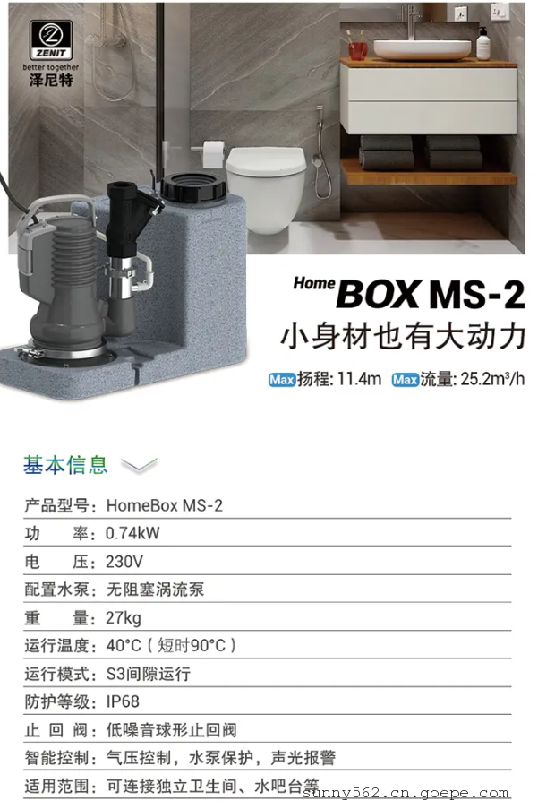 HomeBox MS-2 IP68防护等级,自带智能控制柜,水泵功率0.74KW/220V,*高扬程,11米,*大流量15m³,防水防尘;F级绝缘,运行安静。可以接入坐便器、洗手盆、净身盆排水管、淋浴;适用于地下室排水及同层排水。